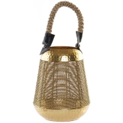 Kaarshouder/windlicht goud metaal. Decoratieve, goudkleurige kaarsenhouder met touw als handvat. Materiaal: metaal/touw. Formaat: ca. 20 cm in diameter en 28,5 cm in hoogte. Kaarsenhouders…