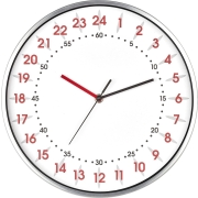 Het bijzondere aan deze wandklok is de aanduiding in 12- en 24-uurs indeling. De grote, zwarte cijfers geven de eerste 12 uren van de dag aan, de kleinere rode betreffen de uren na 12 uur 's middags…