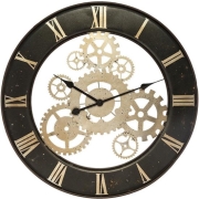 Ronde zwarte landelijke klok met romeinse cijfers en zichtbaar en werkend raderwerk van het merk Clayre…