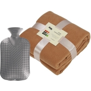 Fleece deken/plaid 200 grams kwaliteit in de kleur camel bruin met formaat 130 x 170 cm samen met een warmwater kruik zilvergrijs van 2 liter. Wasvoorschrift bank dekentje: machine wasbaar op 30…
