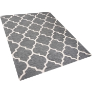 Behaaglijk grijs tapijt met klassiek beige patroon. Dit handgemaakte vloerkleed combineert een decoratief en modern design met een prachtige quatrefoil-print. Het vloerkleed is handgetuft met zachte…